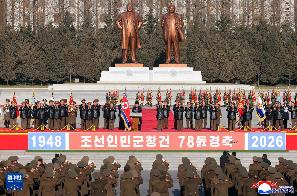 据朝中社2月9日报道,在朝鲜人民军建军78周年之际,朝鲜劳动党总书记、国务委员长金正恩8日视察国防省,祝贺并勉励全军官兵。新华社/朝中社
