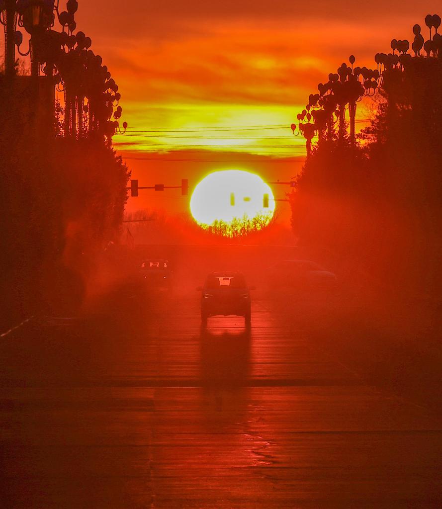 地球绕太阳公转时,太阳直射点在南北回归线之间移动,使得太阳升起和落下的方位在一年中呈周期性变化。当城市街道走向与太阳出没的方位角一致时,太阳会恰好出现在街道尽头正上方的地平线上,形成悬日景观。