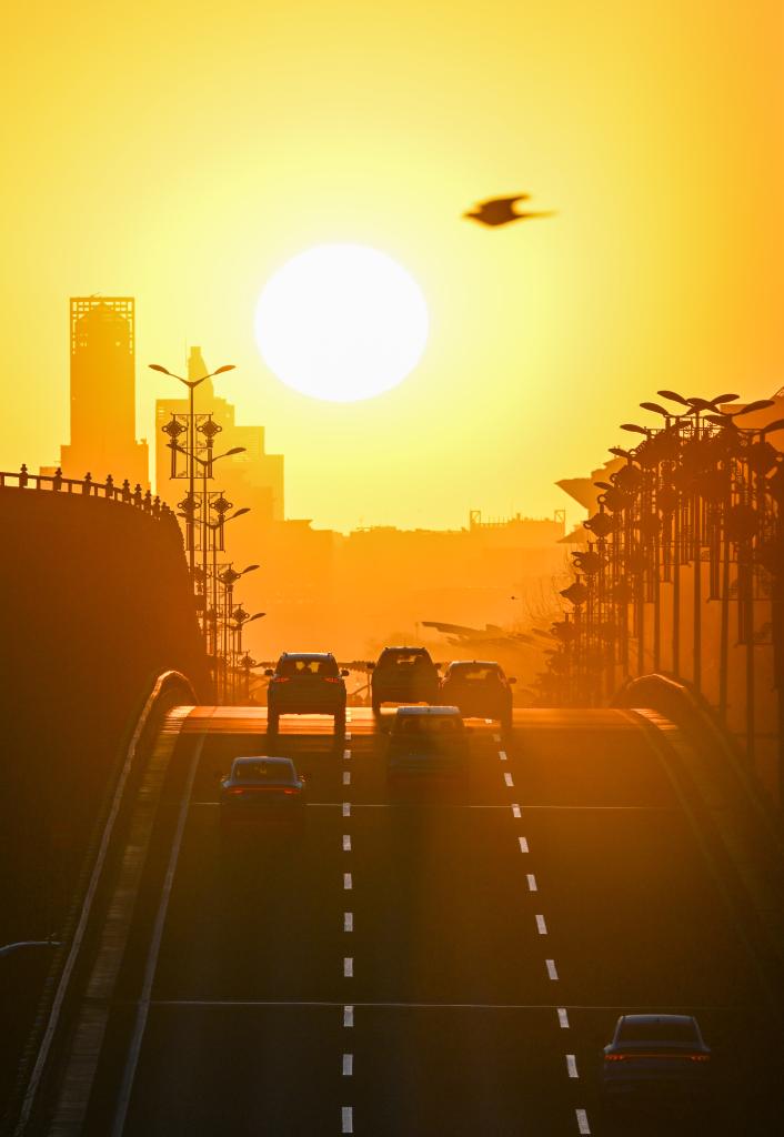 春分这天,行色匆匆的你不妨停下脚步,凝望这轮红日,在喧嚣中拥抱这份难得的宁静与温柔。当然,你也可以随手举起相机或手机,拍下一张悬日、街道和高楼同框的画面。光与城在此刻相遇,这是一份专属你的城市浪漫。(记者周润健)