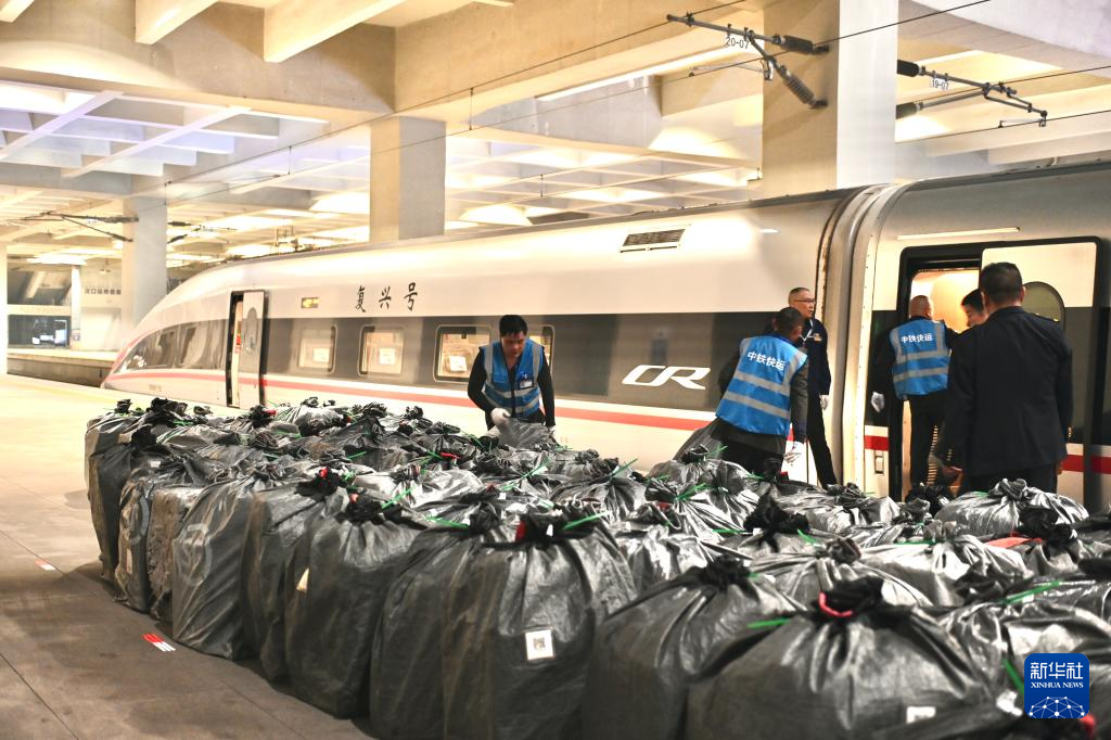 新华社武汉11月15日电(记者王自宸、潘志伟)15日凌晨5时,汉口站站台上,已装袋整齐的服装、生鲜、电子产品等10吨快件有序摆放,铁路工作人员正将包裹搬进高铁车厢。当天,DJ892次和DJ890次高铁动车组列车分别从汉口站和广州白云站开出,华中地区与粤港澳大湾区新添高铁快运线路。