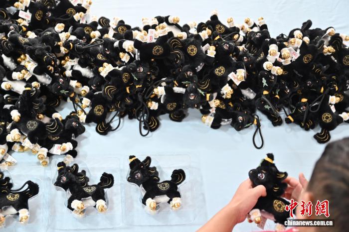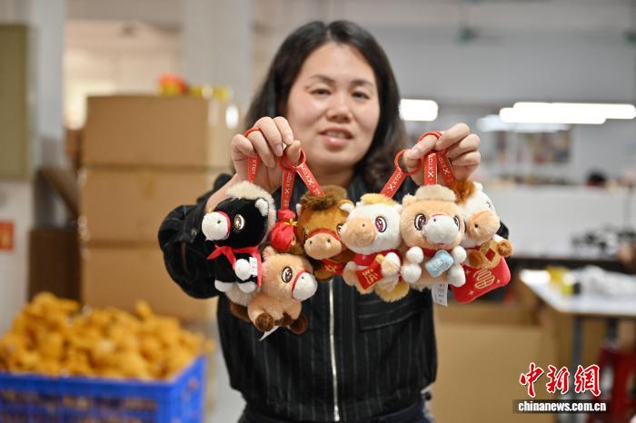 1月14日,广东省东莞市茶山镇的工作人员展示马年毛绒玩偶。随着马年春节临近,广东东莞这座“中国潮玩之都”迎来马年“潮玩”生产销售热潮。中新社记者 陈楚红 摄