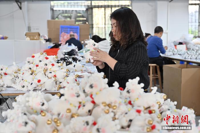 1月14日,广东省东莞市茶山镇的工作人员在包装马年毛绒玩偶。随着马年春节临近,广东东莞这座“中国潮玩之都”迎来马年“潮玩”生产销售热潮。中新社记者 陈楚红 摄