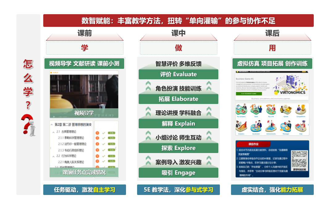 “数智赋能”扭转“单向灌输”的参与协作不足。教学团队构建“数智赋能”模式,借助数智化教学技术,通过课前“学”、课中“做”、课后“用”三阶段教学流程,实现“学做用一体”,扭转“单向灌输”的参与动能协作状态。课前通过学习通布置任务点、完成任务点、增值任务点的方式,激发学生进行自主学习,借助AI助教精准定位教学难点;课中采用基于建构主义的5E教学框架,通过“吸引(Engage)—探索(Explore)—解释(Explain)—拓展(Elaborate)—评价(Evaluate)”五个环节激发学生学习热情,深化参与式教学;课后通过虚拟仿真训练、参与校企合作项目,让学生面对真实管理课题,强化能力拓展训练。