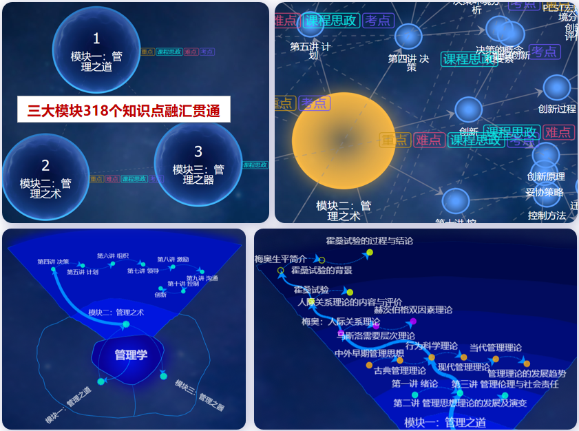 “纵向贯通”破解“浅尝辄止”的知识构建。教学团队基于“深耕心田”创新理念,采用“纵向贯通”的模式对《管理学》课程内容进行重构,整合形成了“管理之道、管理之术、管理之器”三大模块的教学内容,系统介绍管理理论、管理职能以及管理工具等知识。教学中融入心理学、数学等跨学科知识,构建知识图谱和学习地图,夯实理论根基,追求“修身、齐家、治国”的综合育人理想。