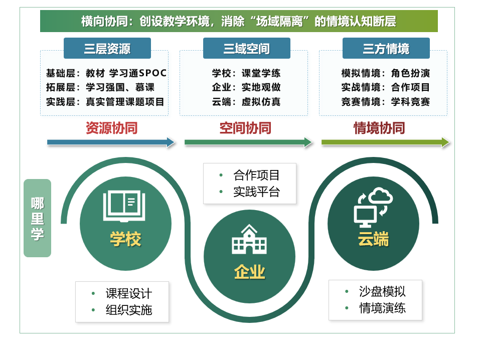 “横向协同”消除“场域隔离”的情境认知断层。基于“广拓黉宫”创新理念,教学团队构建了“横向协同”模式,创设“学校-企业-云端”三方联动的教学环境新生态。通过线上线下融合建设课程的基础资源、拓展资源及实践资源,丰富教学载体;通过学校-企业-云端三域联动,构建三维教学空间,打破课程教学的孤岛效应和时空限制,深度实现产教融合、提升学生专业能力,助力学生实现所学即所用;通过“模拟-实战-竞赛”三方情境,融合虚拟决策、真实问题解决与创新挑战,使学生实现从理论推演到实践落地的能力跃迁。