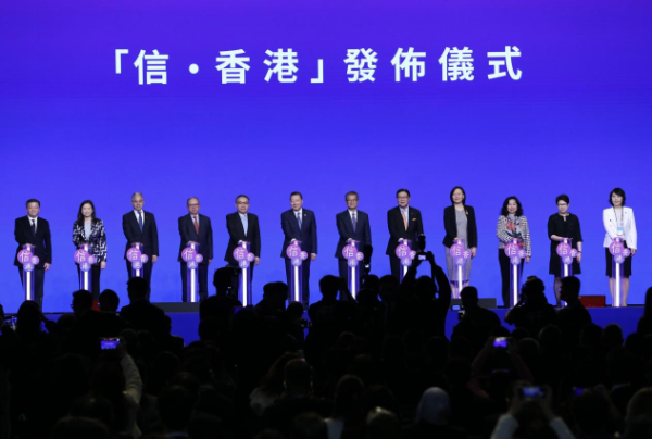 全球产业峰会期间,中信集团举办“信·香港”发布仪式,张文武、曾琪、鲍建敏与陈茂波、香港财经事务及库务局局长许正宇、马时亨、香港旅游发展局主席林建岳等嘉宾共同上台,发布“信·香港”品牌。