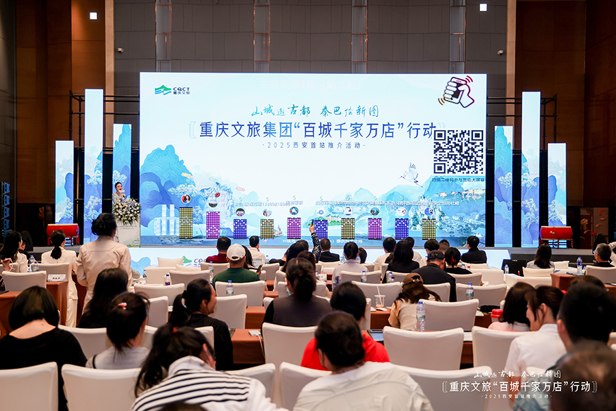 “山城邀古都・秦巴绘新图——重庆文旅集团‘百城千家万店’行动”2025西安首站推介活动现场。