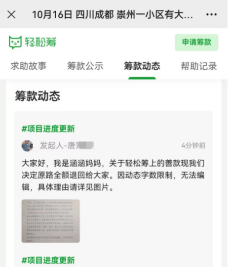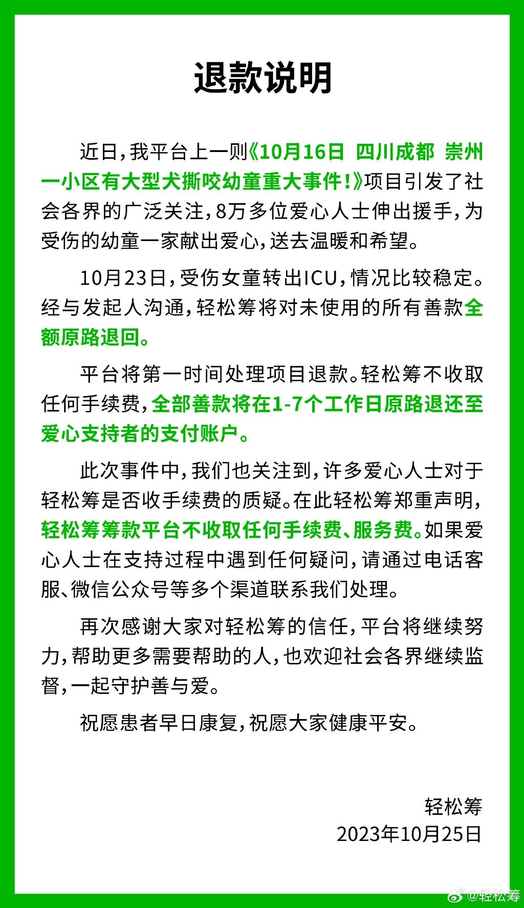 10月25日晚7点,轻松筹官方微博发布退款说明,称成都被狗咬伤女童转出ICU,情况比较稳定,经与发起人沟通,将对未使用的所有善款全额原路退回。善款将在1-7个工作日内原路退回至捐款者支付账户。