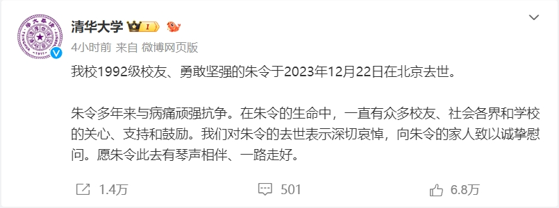 12月23日,清华大学官方发布消息,该校校友朱令去世。