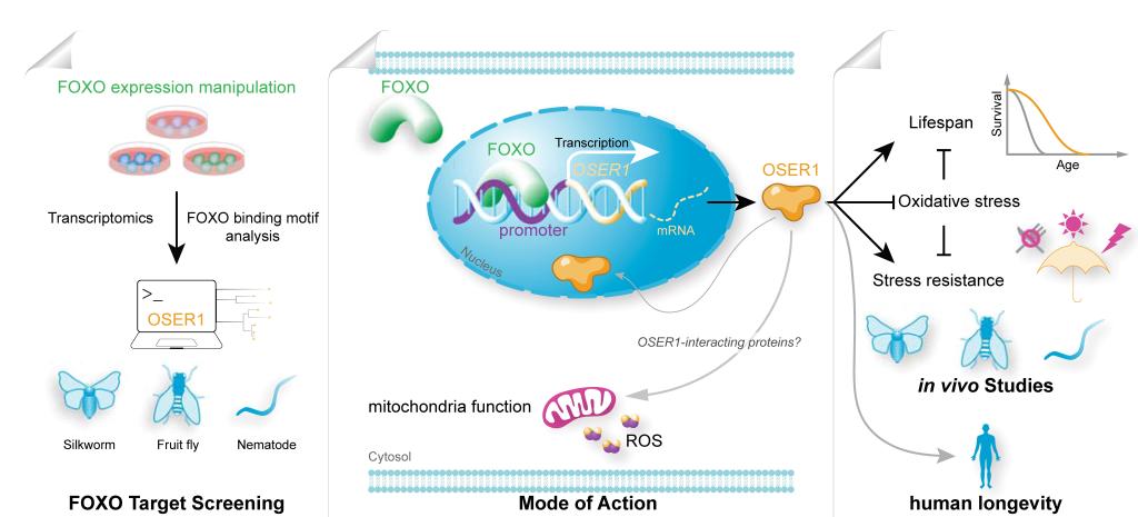 为了阐释OSER1调节长寿的作用机制,研究团队在家蚕、线虫和果蝇中进行了一系列的分子生物学实验。研究结果共同表明,OSER1是叉头框蛋白O的直接靶基因,OSER1能够响应过氧化氢诱导的氧化应激,并通过提升机体氧化应激防御力发挥延长寿命的作用。