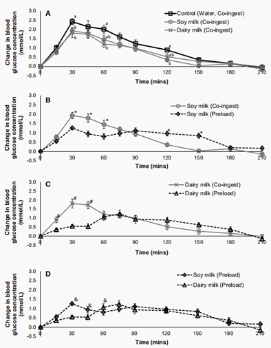 如果都是提前喝,比较牛奶和豆奶的效果,则会发现先喝牛奶组的血糖波动更小,血糖峰值更低。