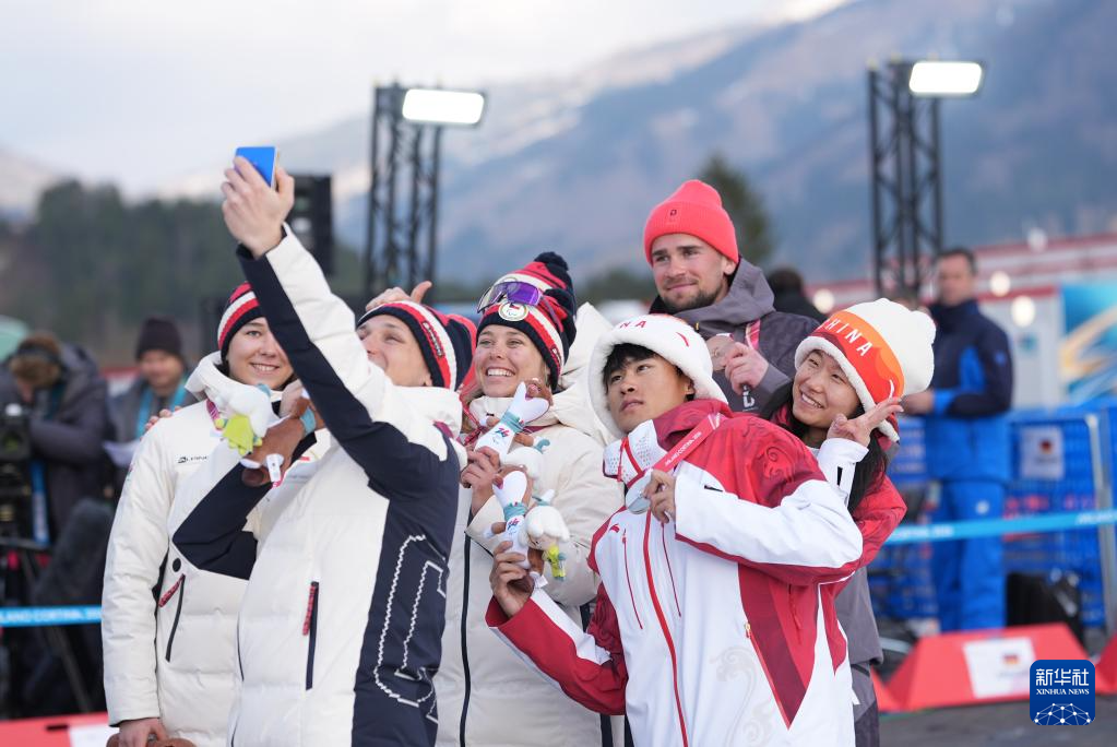 3月13日,亚军中国选手王跃(右一)与引导员陈国铭(右三)在颁奖仪式上与其他获奖运动员自拍。