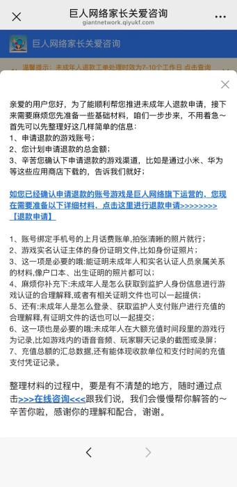 记者就此咨询了巨人网络客服,其明确回复了申请未成年人充值退款需要提交的一系列材料,当询问是否能够全额退款时,客服回复“具体退款金额的多少是要以审核答复为准的”,至于会不会对注册巨人网络其他游戏有影响,客服明确回复“没有”。