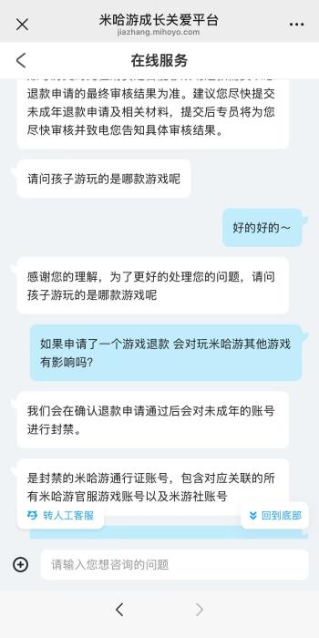 米哈游客服同样提供了需要的证明材料清单,并表示退款金额以实际审核结果为准。而被问及申请未成年人充值退款是否会影响其他游戏,客服回复“申请通过后会对未成年的账号进行封禁”,且“封禁的是米哈游通行证账号”。