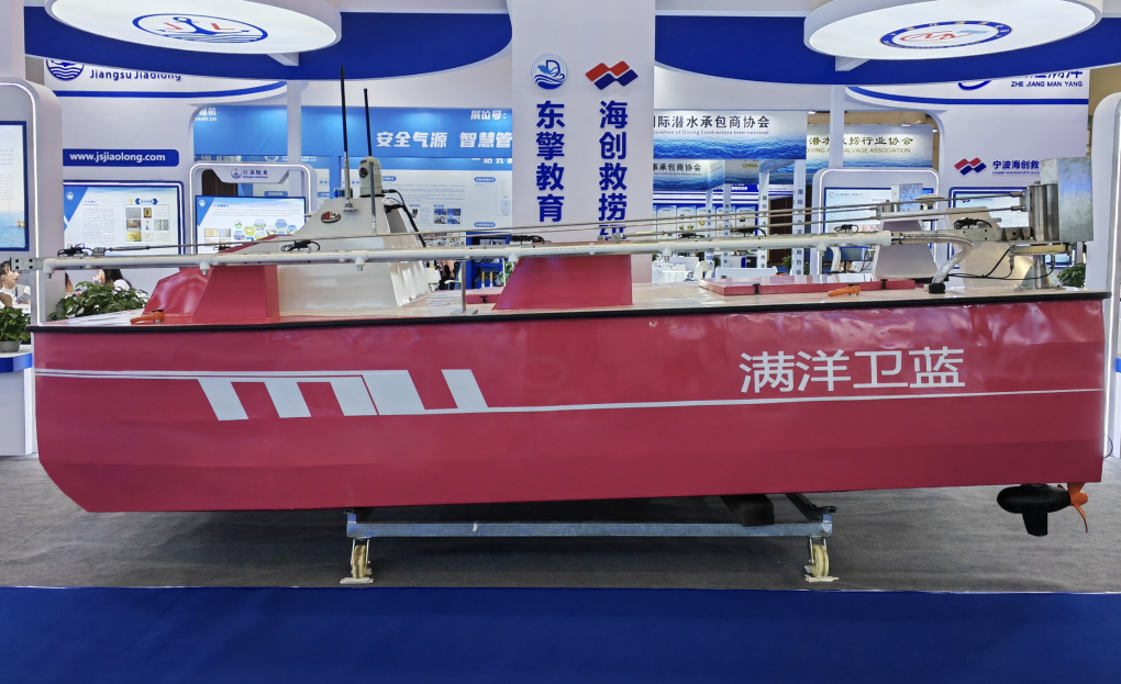 展会现场,浙江满洋船务工程有限公司自主研发的“满洋卫蓝”海上溢油处置无人艇吸引众多目光。这款无人艇专为溢油应急处置设计,能在复杂海况下远程操控或自主航行,快速赶赴污染海域开展作业。