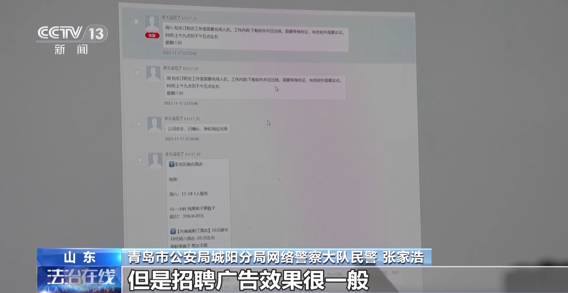 青岛市公安局城阳分局网络警察大队民警 张家浩:开始招聘兼职人员的时候,他会写工作内容就是下载软件并且注册,同时标明要带身份证,有些软件需要实名,但是招聘广告效果很一般,因为很多人看到这种类型的招聘广告需要带身份证之后,他就不来兼职了。