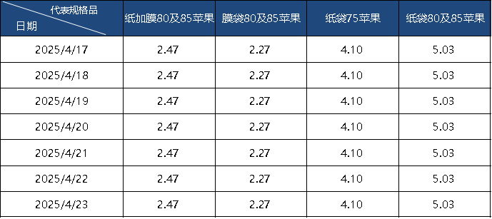 监测显示,本周(4月17日至4月23日)纸加膜80及85规格富士苹果均价为2.47元/斤,膜袋80及85规格富士苹果均价为2.27元/斤,纸袋75规格富士苹果均价为4.10元/斤,纸袋80及85规格富士苹果均价为5.03元/斤。