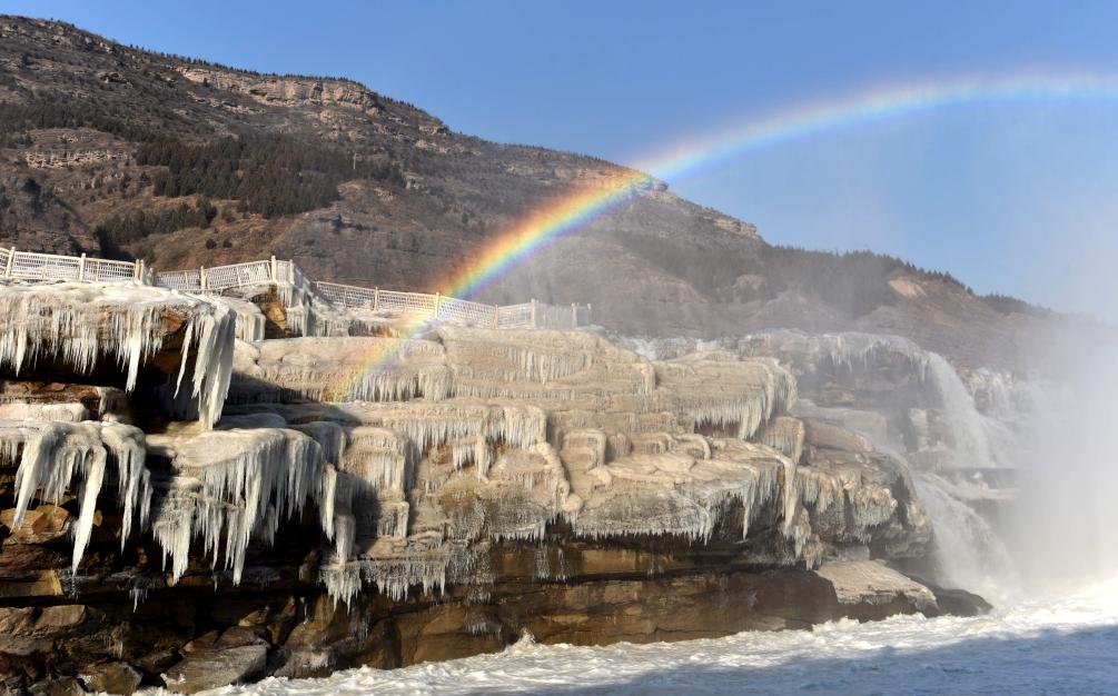 黄河壶口瀑布现“冰瀑玉壶”壮美景色