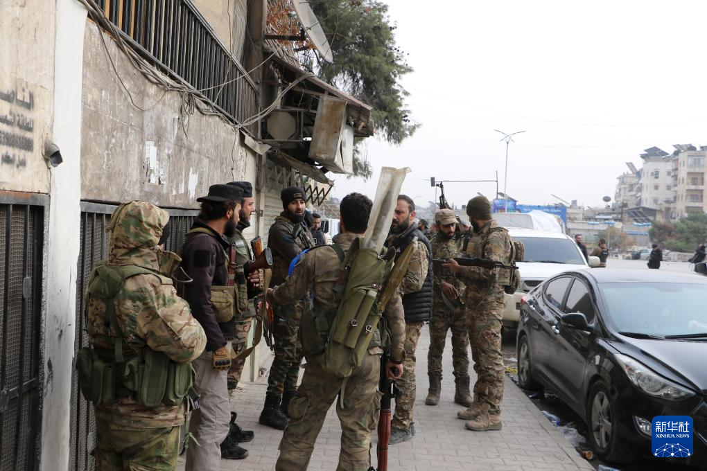 1月8日,在叙利亚阿勒颇市,叙过渡政府士兵在交流。新华社发
