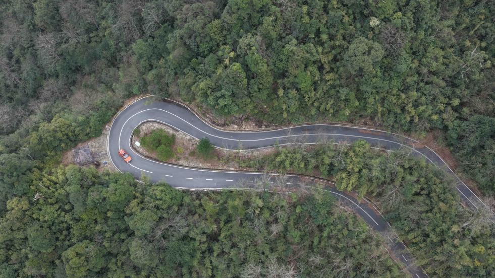 3月17日,广东省乳阳林场八宝山管护站护林员驾驶车辆在南岭山脉公路上行驶(无人机照片)。