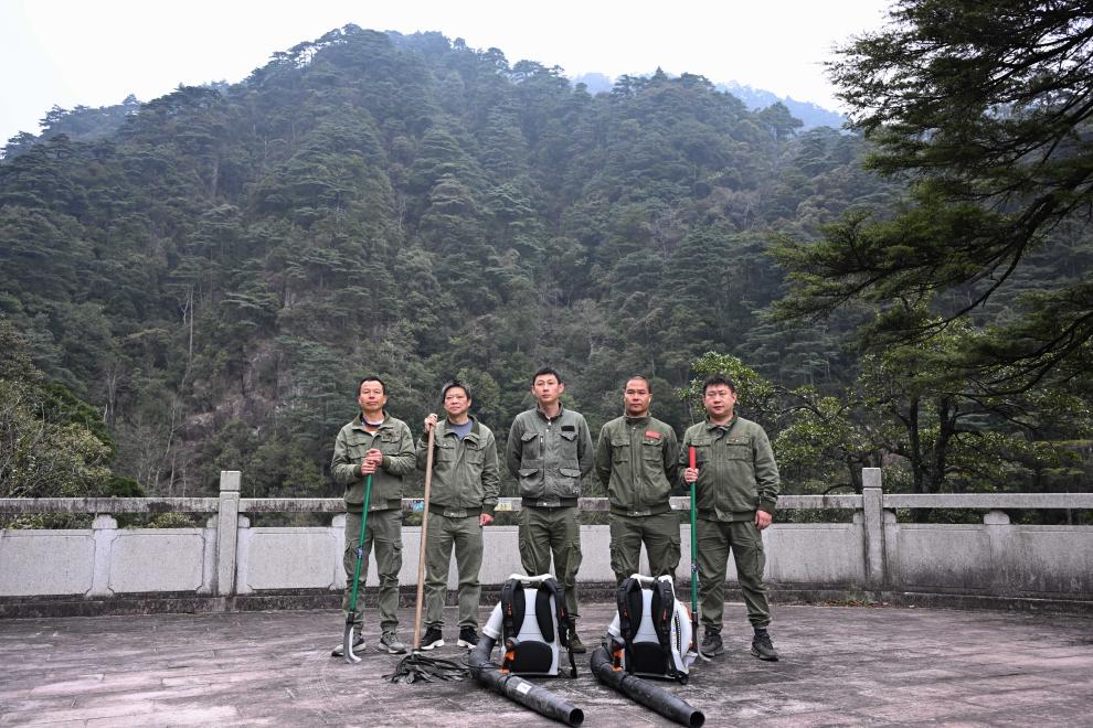 3月17日,广东省乳阳林场八宝山管护站护林员张亚平、王朝阳、周智鹏、张小平、周水金(从左至右)在小黄山便道合影并展示巡山工具。
