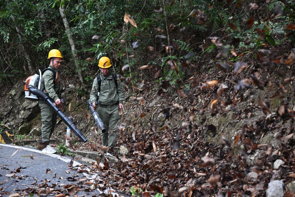 3月17日,广东省乳阳林场八宝山管护站护林员张小平(左)、王朝阳在巡山途中清理堆积的枯枝落叶。