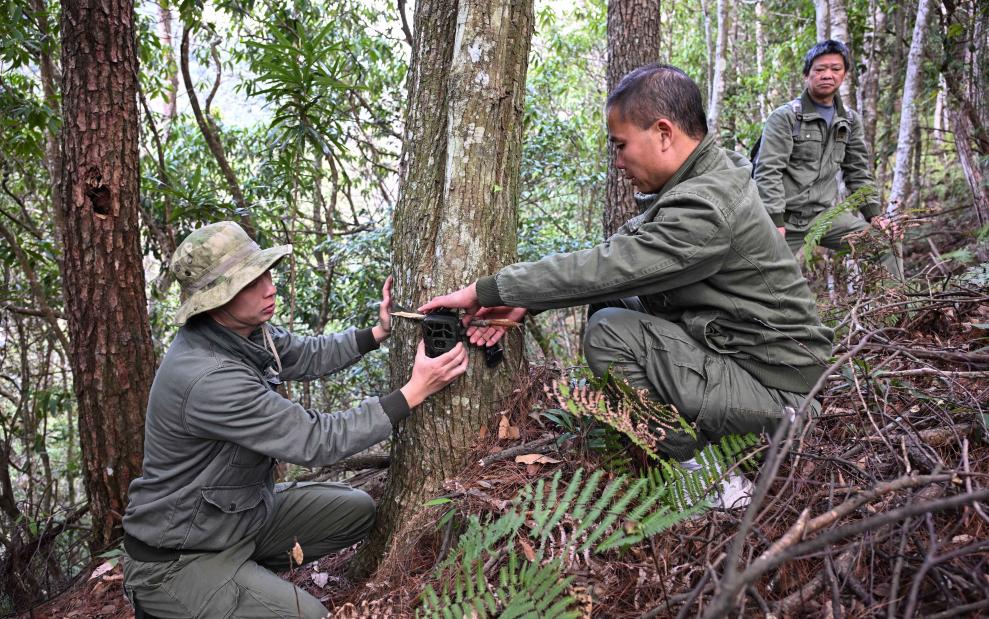 3月17日,广东省乳阳林场八宝山管护站护林员在鸡公坑便道巡山途中,周智鹏(中)在准备红外相机。