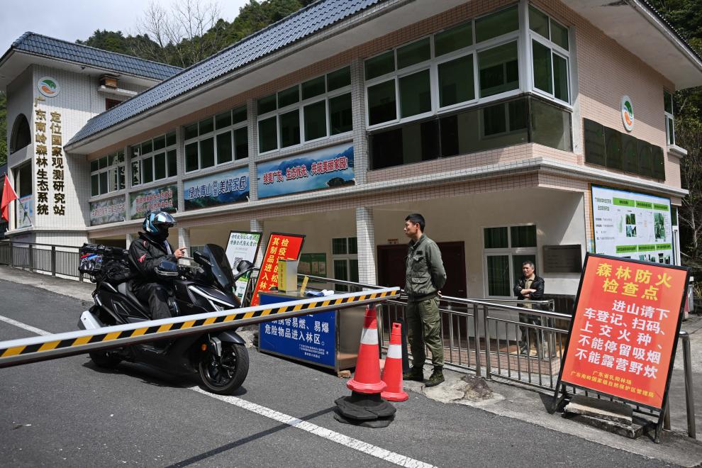 3月17日,广东省乳阳林场八宝山管护站负责人周智鹏(中)与来自湖南的自驾游客交流并宣传防火常识。
