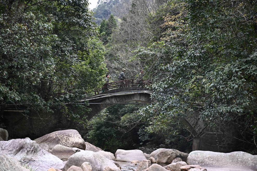 3月17日,广东省乳阳林场八宝山管护站护林员在巡山路上途经河流。