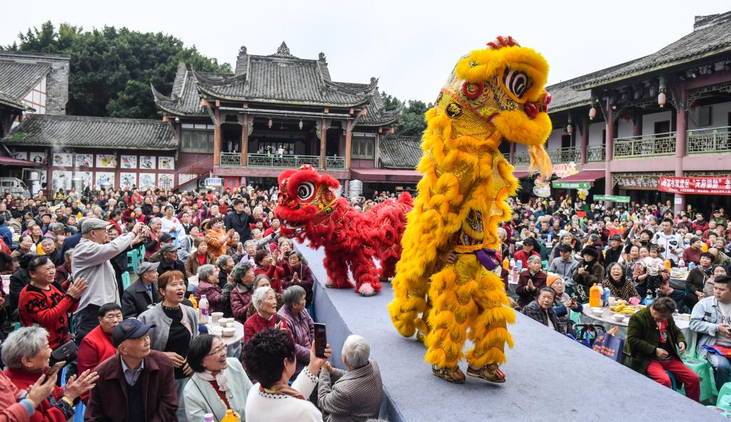 10月28日,在四川省成都市双流区黄龙溪镇,演员为参加“长寿坝坝宴”的老人表演舞狮,迎接重阳节。新华社发(李向雨 摄)