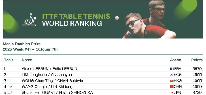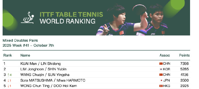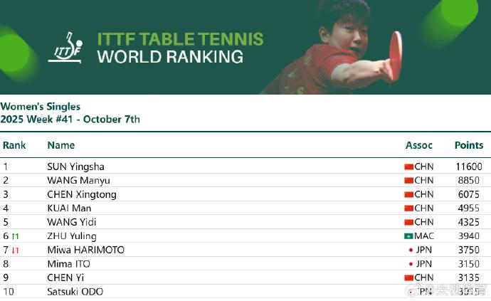 国际乒联公布2025年第41周世界排名