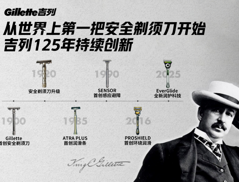 这把改变行业的安全剃须刀,奠定了吉列125年的品牌基因。125年来,安全、贴合、舒适是吉列刻在产品里的灵魂。从世界上第一把安全剃须刀到多层渐进式刀片,从纯手动到手电合1的微震科技,超过12轮重大剃须技术和产品的迭代,超过500项精密专利的积累,让剃须从一项“生活任务”进化为一种关乎“体面”与“自我”的享受仪式。
