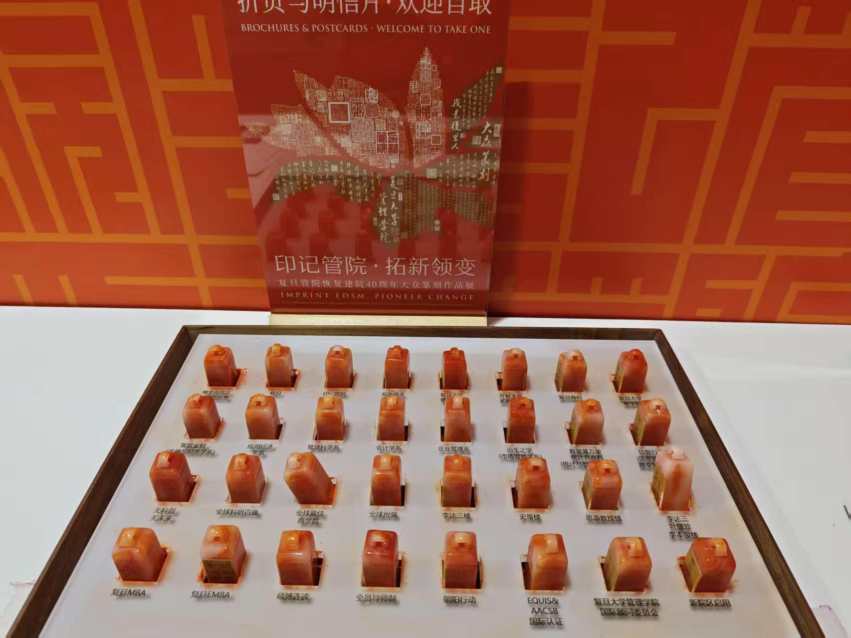 图为现场展示以“复旦大学管理学院”恢复建院40周年为主题的篆刻印章。