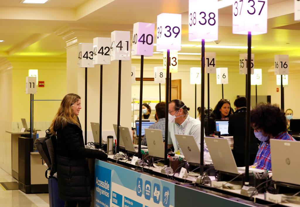 3月5日,选民在美国旧金山一个投票站内投票。美国2024年总统选举5日迎来所谓“超级星期二”党内初选,十几个州和美国领地的选民当天为竞选人投票。初选是美国总统选举的第一阶段。今年美国大选投票日为11月5日。新华社发(李建国摄)