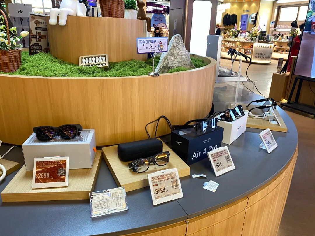 在北京朝阳区的一家商场里,AI眼镜在货架上集中陈列,十来款产品从简洁轻量的入门款到功能齐全的最新款一字排开,价格从几百元到近万元不等。