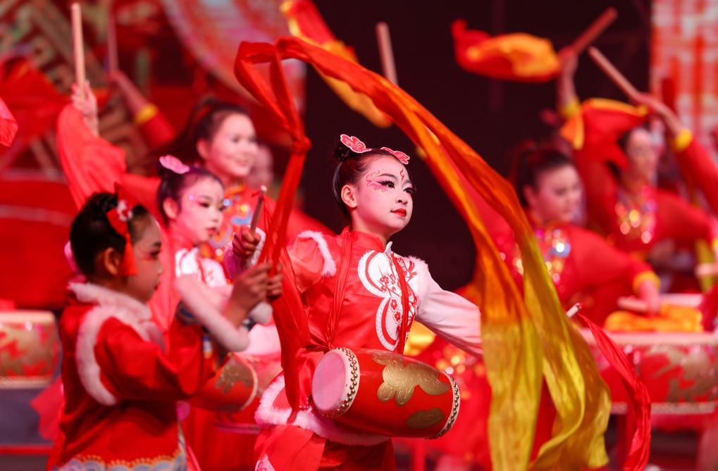2月12日,演员在哈尔滨市道里区“我们的村晚”现场表演秧歌。