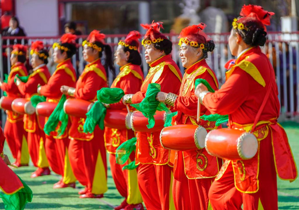 2月12日,民间花会队在北京市平谷区苹东市集广场演出民俗节目。
