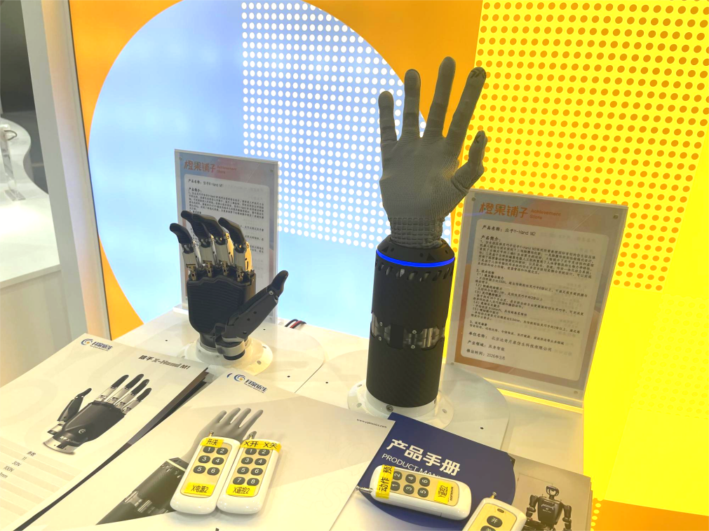 该公司在“橙果铺子”展示了信手X-Hand M1、应手Y-Hand M2两款产品。其中,信手X-Hand M1拥有类人手的尺寸与节段比例,其掌弓采用仿人手横弓、纵弓三维结构,同时采用仿生环形斜轴,可完美复现人手特性,凭借高仿生、强抓握、柔顺性、高性能等设计优势,为复杂场景下的精细操作提供了突破性解决方案;应手Y-Hand M2依托任雷教授国际首创的仿生拉压体机器人理论与技术实现了三项颠覆性创新,在“力量、速度、精度、灵活、柔顺”方面实现五位一体协同提升,在仿生灵巧手领域创下多项行业纪录。
