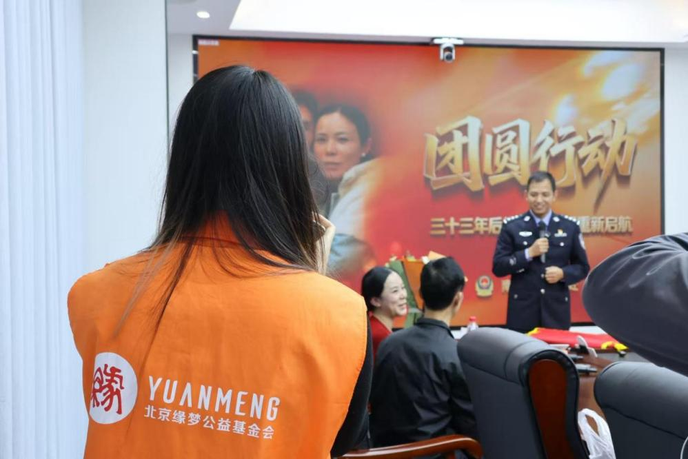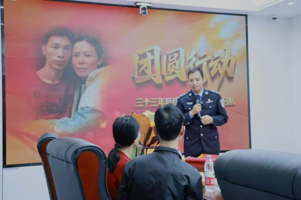 图为民警汪挺(左)向姐弟俩介绍DNA比对过程。