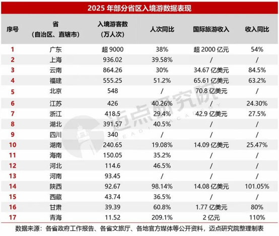 各省(自治区、直辖市)入境旅游发展情况,依据广东、上海、云南、福建、北京、江苏、浙江等为代表的17个省区公布的入境旅游数据,入境游客数与国际旅游收入两项核心指标同比“双位数双增长”、“创历史新高”现象集中。以华南地区的广东省为例,2025年接待入境游客超9000万人次,旅游外汇收入超2000亿元,分别同比增长38%和54%。以上海和北京为例,作为入境游的“第一站”和枢纽,2025年上海累计接待入境游客达到936.0万人次,同比增长39.6%,创历史新高;2025年北京共接待入境游客548.0万人次,同比增长39.0%,其中外国旅游455.7万人次,同比增长41.8%;实现旅游花费505.6亿元,增幅达44.7%,创历史新高。此外,华东地区的福建、江苏、浙江,华中地区的湖北、湖南,西北地区的陕西、甘肃、青海,西南地区的云南、四川等各省入境旅游表现亦较为优异,如云南“引客入滇”入境旅游激励政策效应明显,全省2025年入境游客864.26万人次,陕西和青海的国际旅游收入同比翻倍,各省旅游开放度、国际化服务水平逐步提升。