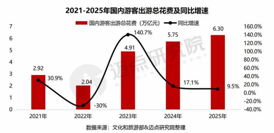 与居民出游热情相对应,中国居民旅游消费意愿亦不断增强,据文化和旅游部数据,2025年,国内居民出游花费6.3万亿元,比上年同期增加0.55万亿元,同比增长9.5%,文旅消费市场动能释放、活力彰显。