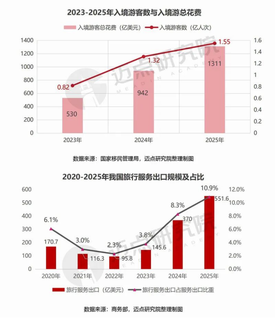 2025年,我国入境旅游市场呈现高开高走态势,入境人次和总花费均实现大幅跃升。依据《中华人民共和国2025年国民经济与社会发展统计公报》数据:2025年入境游客15450万人次,增长17.1%,其中外国人3517万人次,香港、澳门和台湾同胞11932万人次。入境游客总花费1311亿美元,增长39.2%。通过免签入境外国人3008万人次,增长49.5%,显示出免签政策的显著红利效应。