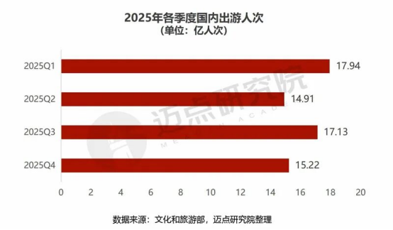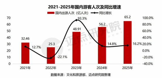 伴随居民可支配收入的提高、休假制度的逐步完善(全国法定假期+地方探索中小学春秋假与雪假等)、消费观念的变革,受惠于扩大消费的政策刺激、文旅供给的迭代创新、交通设施便利化等因素,旅游已成为人民群众生活方式的重要组成部分,旅游大众化、常态化特征愈加凸显。据文化和旅游部数据,2025年,国内居民出游人次65.22亿,超越2019年的60.06亿人次,创历史新高;同比层面,比2024年同期增加9.07亿,同比增长16.2%,连续三年保持“两位数”高增长态势。