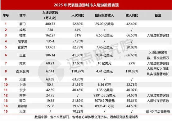 代表性城市入境游发展情况,除北京、上海等一线城市外,以厦门、成都、南京、长沙等为代表的新一线城市,以桂林、三亚、张家界、西双版纳、大理、景德镇、上饶等为代表的特色旅游城市,均成为外国游客竞相打卡和奔赴的旅游目的地城市,入境旅游目的地形成多元化、下沉化发展格局。部分城市入境游数据表现:2025年,厦门市入境游市场的爆发式增长,入境游客量约400万人次、同比增幅超50%;三亚市入境过夜游客规模首次破百万大关;南京市入境游“吸金”能力持续增强,实现旅游外汇收入9.9亿美元,同比增长27%;大连市累计接待入境游客同比劲增70.69%,超越2019年同期水平,创下1985年以来历史峰值;西双版纳州入境旅游人次与收入同比均实现翻番增长,大理入境游客数同比增幅超60%。