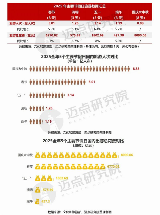 假日旅游市场是观测文旅出行与消费信心的重要风向标,纵观2025全年假日旅游市场,“量价齐升”、“人财两旺”、出入境旅游热度攀升、文旅+跨界融合深化等特征凸显。同时,春节、清明、“五一” 、端午、国庆&中秋5个假期国内出游共计19.48亿人次,假期国内出游总花费共计约1.77万亿元。各主要假日旅游市场表现如下:2025年春节假期,春节申遗带动民俗游热潮,“北冰雪与南避寒”双向奔赴。经文化和旅游部数据中心测算,春节假期8天,全国国内出游5.01亿人次,同比增长5.9%;国内出游总花费6770.02亿元,同比增长7.0%。春节假期国内旅游市场强劲复苏,奠定了全年旅游经济高开高走的市场基础,有力提振旅游强国建设和高质量发展的信心。
