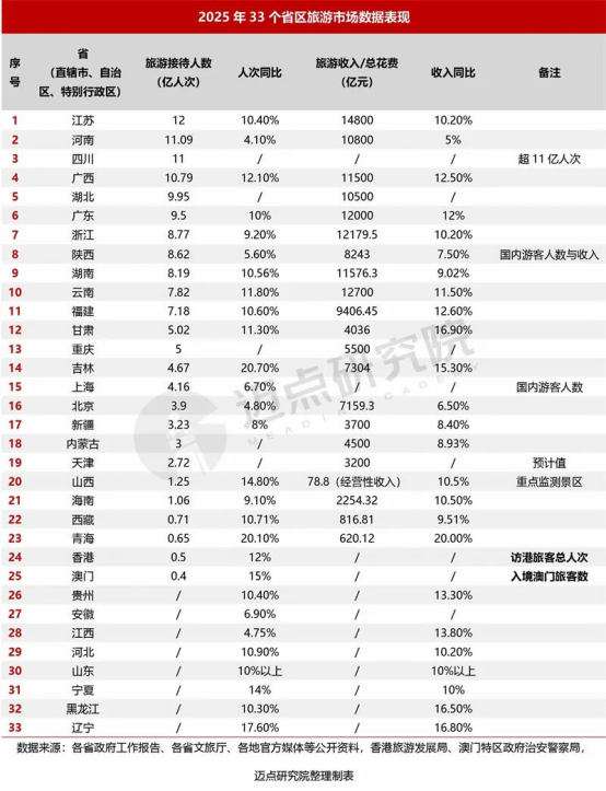 据迈点研究院不完全统计,全国33个省(自治区、直辖市、特别行政区)已公布2025年旅游接待人数、旅游收入总额指标或同比指标。其中,游客人数超10亿人次的包括江苏、河南、四川、广西4个省份,旅游收入(总花费)突破万亿元的涉及江苏、云南、浙江、广东、湖南、广西、河南、湖北8个省份;人数同比超15%的涵盖吉林、青海、辽宁3省,收入同比增速超15%的为青海、黑龙江、甘肃、辽宁、吉林5个省份,东北、西北地区省份的增速相对突出。