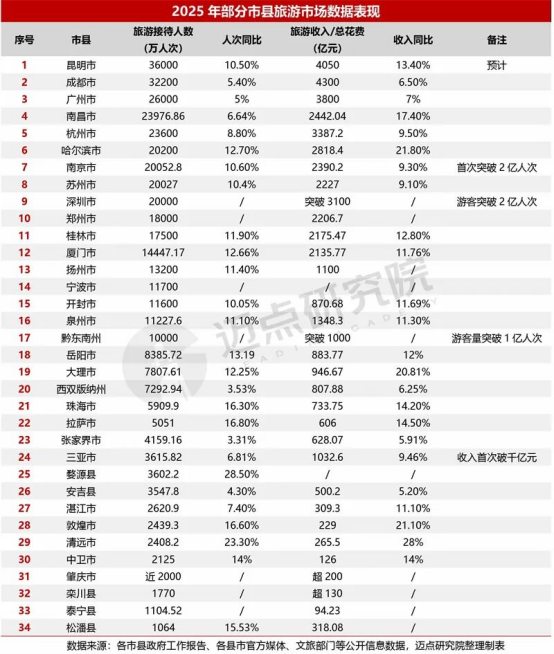 据迈点研究院统计整理的34个市县公布的2025年度旅游数据:游客人数层面,昆明、成都接待游客超3亿人次,广州、南昌、杭州、哈尔滨、南京、苏州、深圳7个地级市为“2亿人次梯队”,郑州、桂林、厦门、扬州、宁波、开封、泉州、黔东南州8个地级市游客量均在1亿人次及以上,岳阳、西双版纳州、珠海、拉萨4个地级市年游客量超5000万人次。县域以大理(约7800万人次)、婺源(约3600万人次)与安吉(约3500万人次)等旅游强县为引领,敦煌、栾川、泰宁、松潘游客量均超千万。