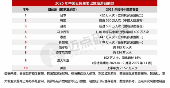 出境旅游出行方式方面,以带薪休假与错峰出行的自由行为主流;出境旅游目的地集中于东南亚等“5小时飞行圈”和“免签朋友圈”,如日本、泰国、韩国、马来西亚、新加坡、越南、澳大利亚、印度尼西亚等。以韩国为例,得益于中韩航线运力充足,以及对团体游客免签政策的延长等因素,据韩国旅游发展局统计,2025年中国大陆赴韩游客已接近550万人次,较去年同比增长19.5%。