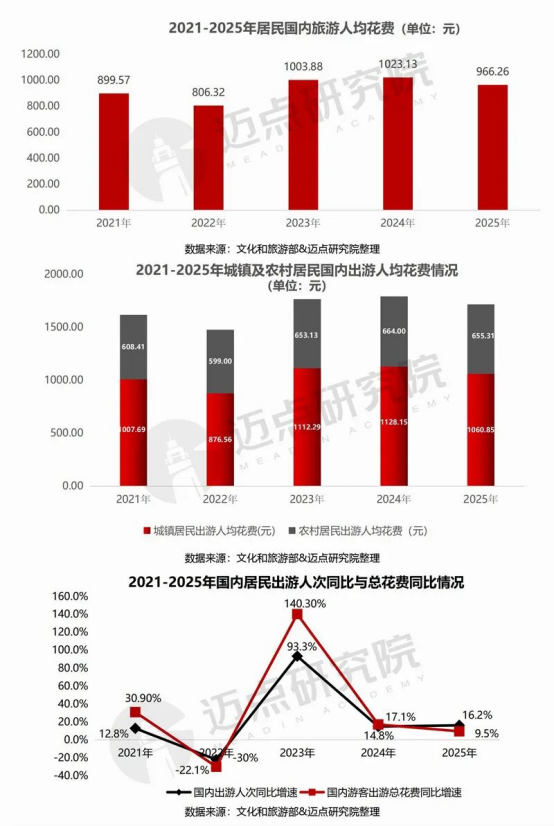 2025年居民国内出游人均消费966.26元,比上年同期减少56.87元,同比下滑5.56%。2025年居民国内出游总花费同比增速(9.5%)低于出游人次同比增速(16.2%),即“量增价缓”格局直接导致人均花费同比下滑。