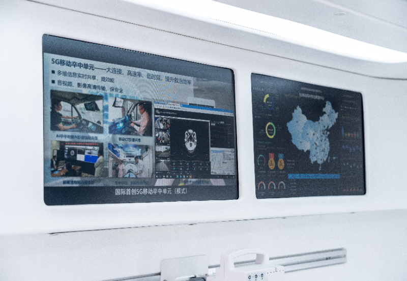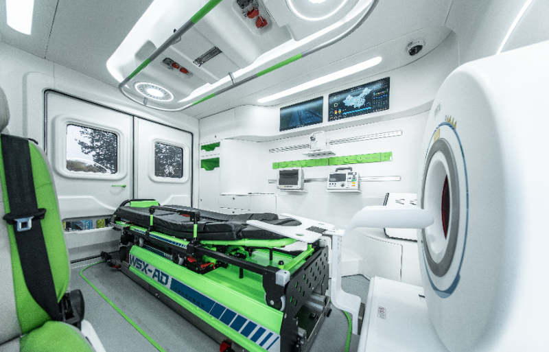此外,车内空间采用场景一体化全包覆设计,针对脑卒中急救场景深度定制,不仅对医护人员操作动线系统优化,大幅提升转运与救治效率,还通过多功能岛台式吊顶、移动CT、电动担架一体式集成设计,以紧凑布局实现空间效能最大化,满足急救场景下的全流程操作需求。